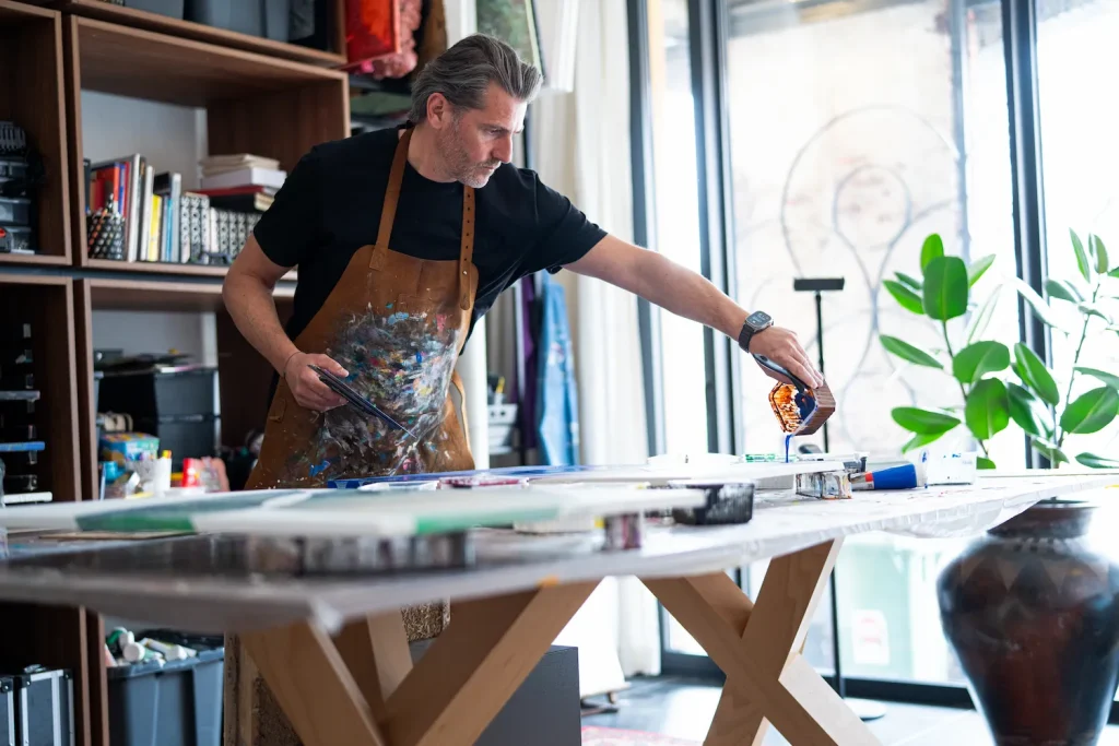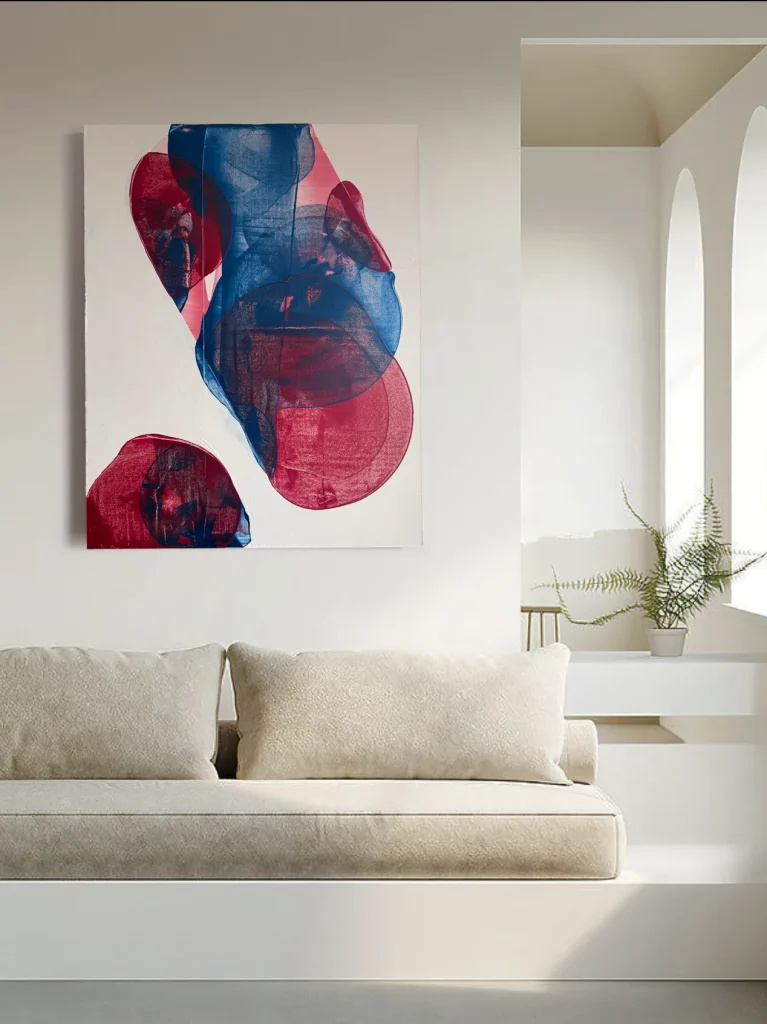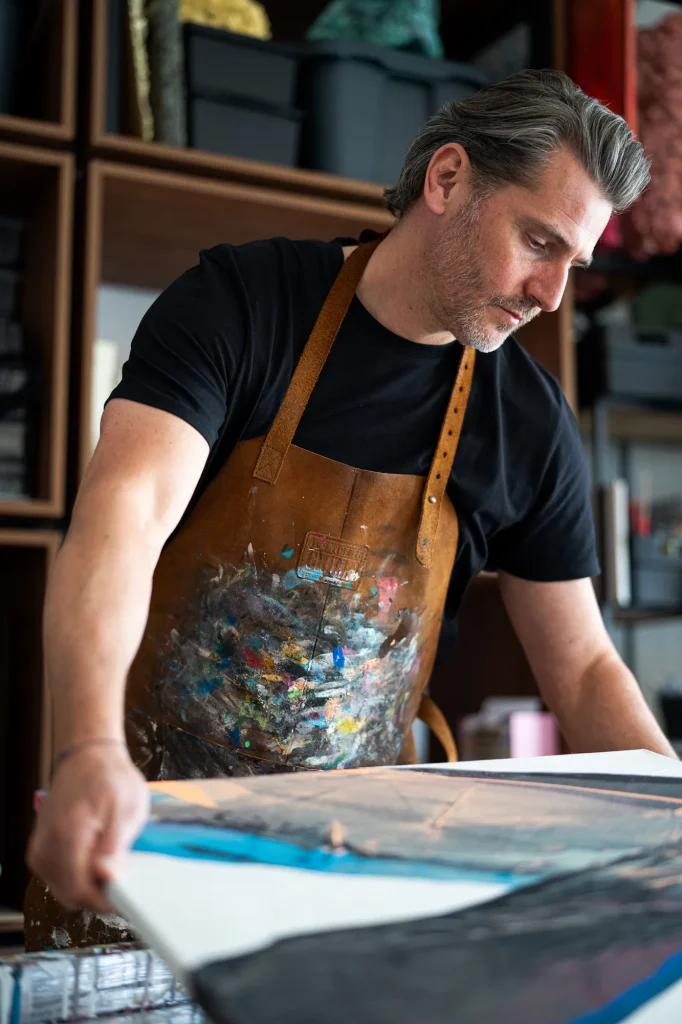 In deze blog neem ik je mee in zijn wereld; waar vorm en gevoel samenkomen, waar kunst niet alleen een plek krijgt aan de muur, maar ook betekenis toevoegt aan het interieur. Zijn inspiratiebronnen, zijn werkwijze en hoe zijn werk zich verhoudt tot interieurontwerp. “Mijn werk ontstaat laag per laag, als een soort visuele reflectie,” vertelt hij. “Ik wil dat het de kijker blijft uitdagen.”